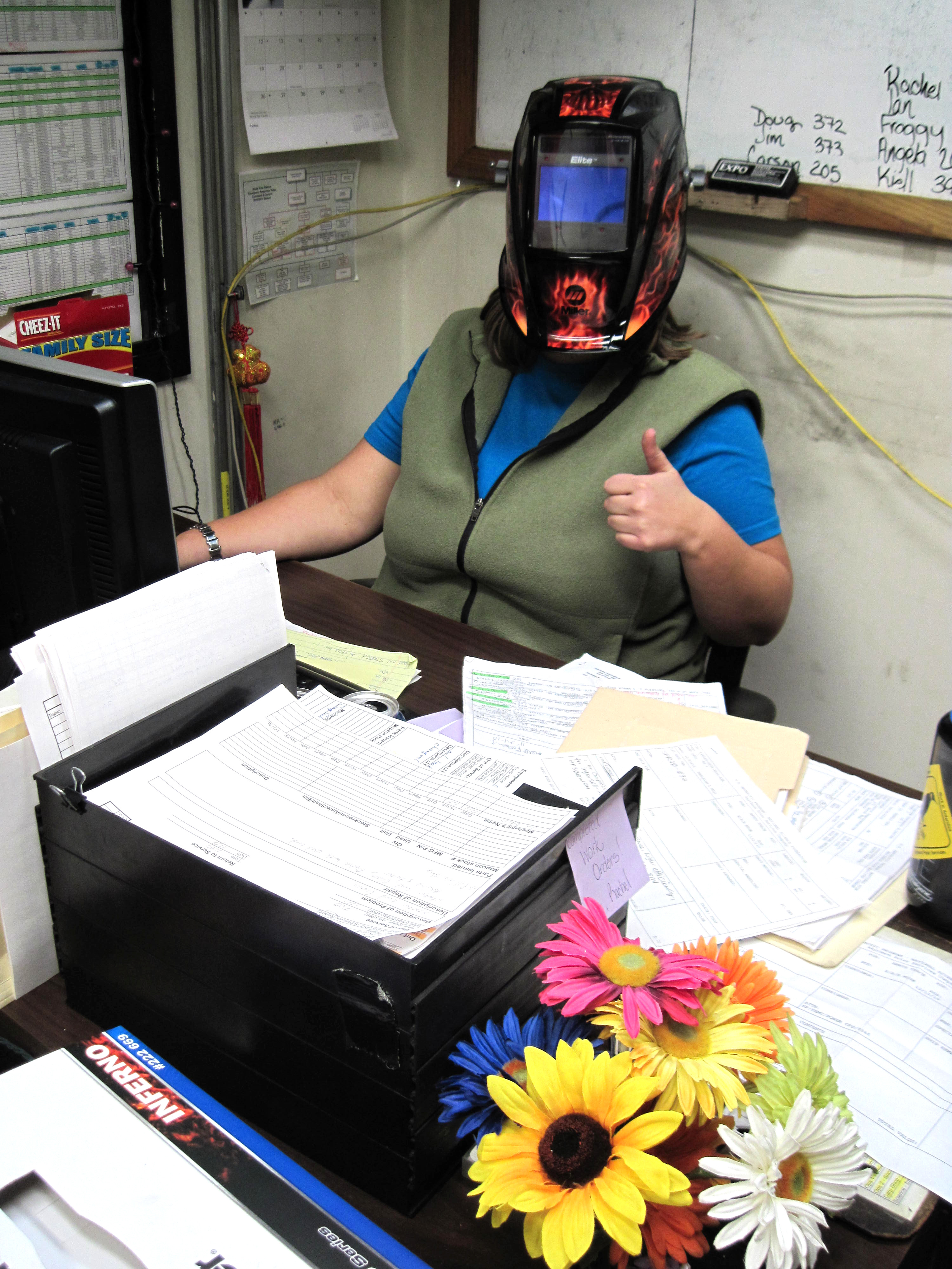 Rachel + new welding helmet + plastic flowers = a normal day in the VMF office.
