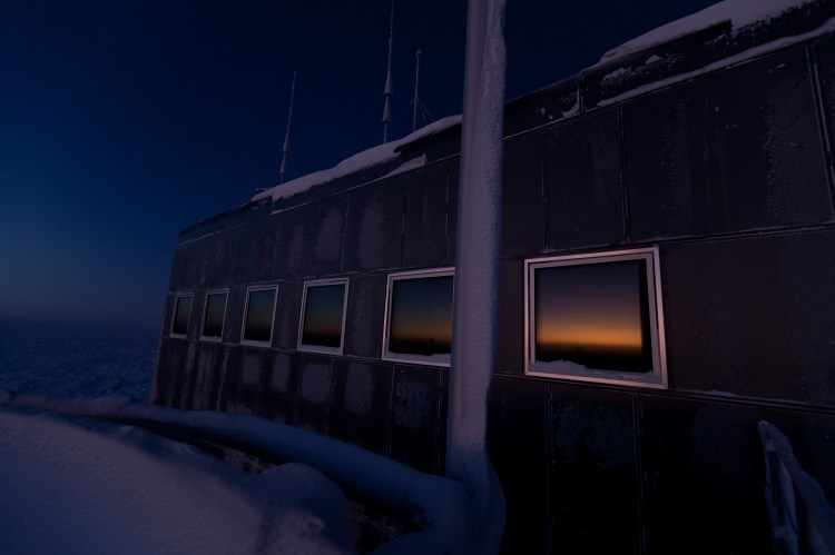 Check out this beautiful photo of the dawn horizon reflected in the station windows at South Pole Station. Photo by Freija Descamps.