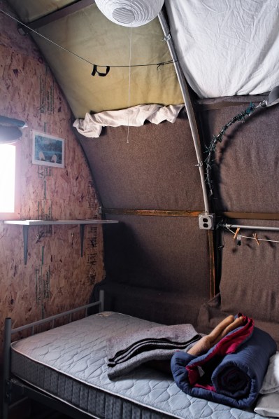 About half of the population of South Pole Station sleeps in tents. They are semi-cylindrical canvas and plywood structures called Jamesways that stand on platforms a bit off the ice and are heated with AN8 jet fuel. Summer camp is about 1/4 mile downwind from the Destination Zulu exit of the main elevated station. There are 13 or so Jamesways in summer camp that have approximately 10 rooms each, and the rooms are divided by plywood walls and/or curtains.