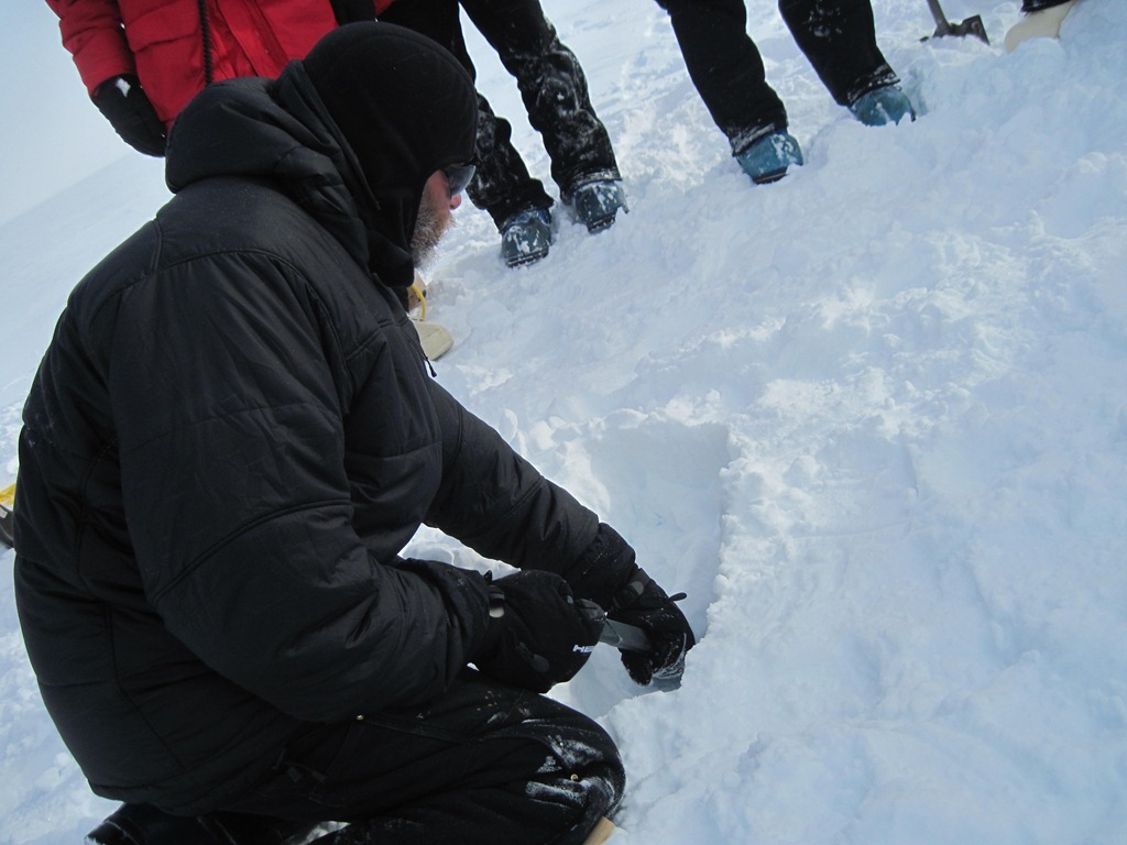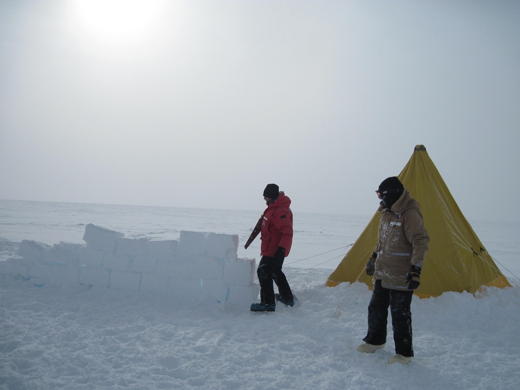 We loaded up the Pisten Bully (car camping, Antarctica-style), and headed out past RF about a mile and a half, to the End of the World. The first thing we did was set up an emergency shelter in case the weather turned bad, a common and fast occurrence in Antarctica, although much more of a risk at McMurdo than here at Pole. This was a Scott tent, designed by Robert Falcon Scott himself, a ridiculously heavy yellow canvas monstrosity that can evidently withstand Antarctic storms, heavily drifted snow, 150 MPH winds, and atomic bomb detonations. We learned how to place a bamboo T-support to prevent tent stakes from ripping out in high winds, how to make an ice wall from igloo blocks cut with a saw from a little ice-quarry, how to best build a galley hole/wind wall, how to best build a toilet hole/wind wall, and how to dig and protect a sleeping trench.