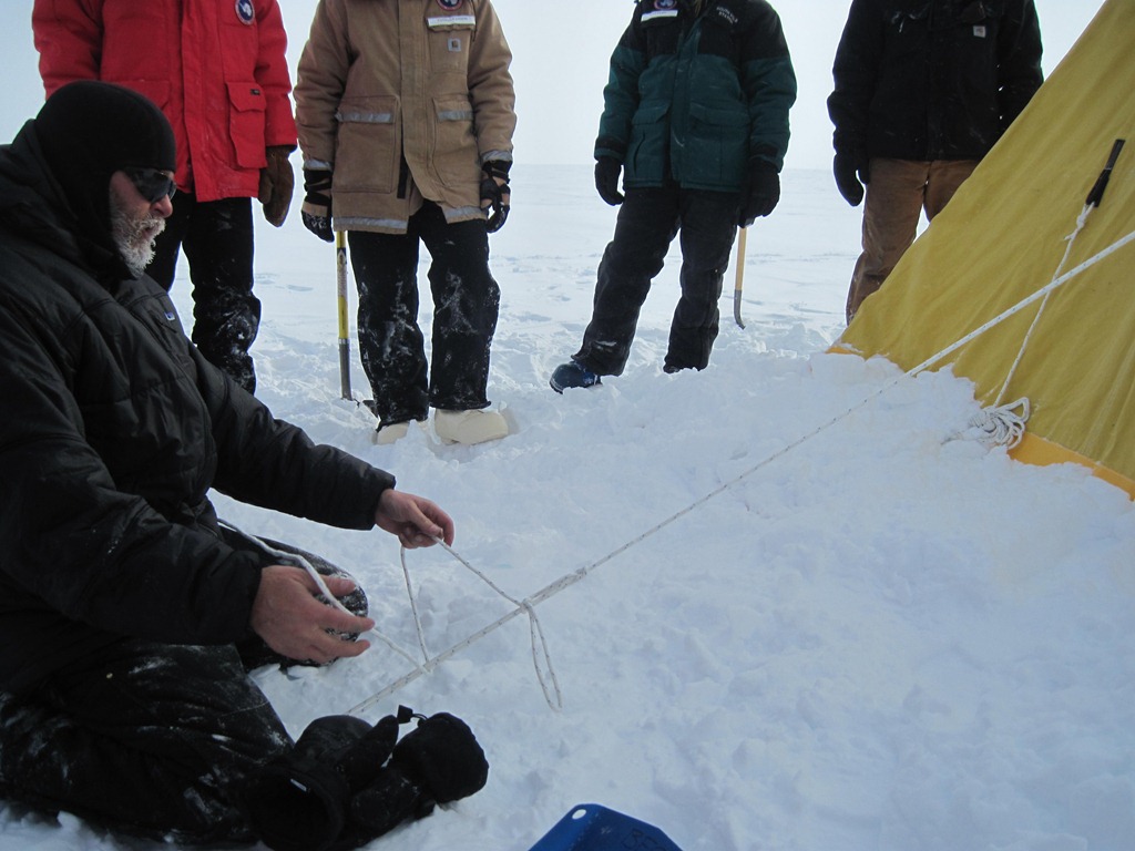 We did classroom type stuff for the first part of the morning and had calorie-intense lunches: Reuben sandwiches, chicken soup and french fries. After stuffing ourselves to the point of discomfort, we put on extra fleece pants, donned our balaclavas, used a flushing toilet for the last time and filled our water bottles. The weather was hazy and overcast, which was a good thing because weather like that usually traps warm-ish air above us. The actual temperature was somewhere between –20 and –30 F, with windchills between –40 and –50 F. Perfect camping weather.
