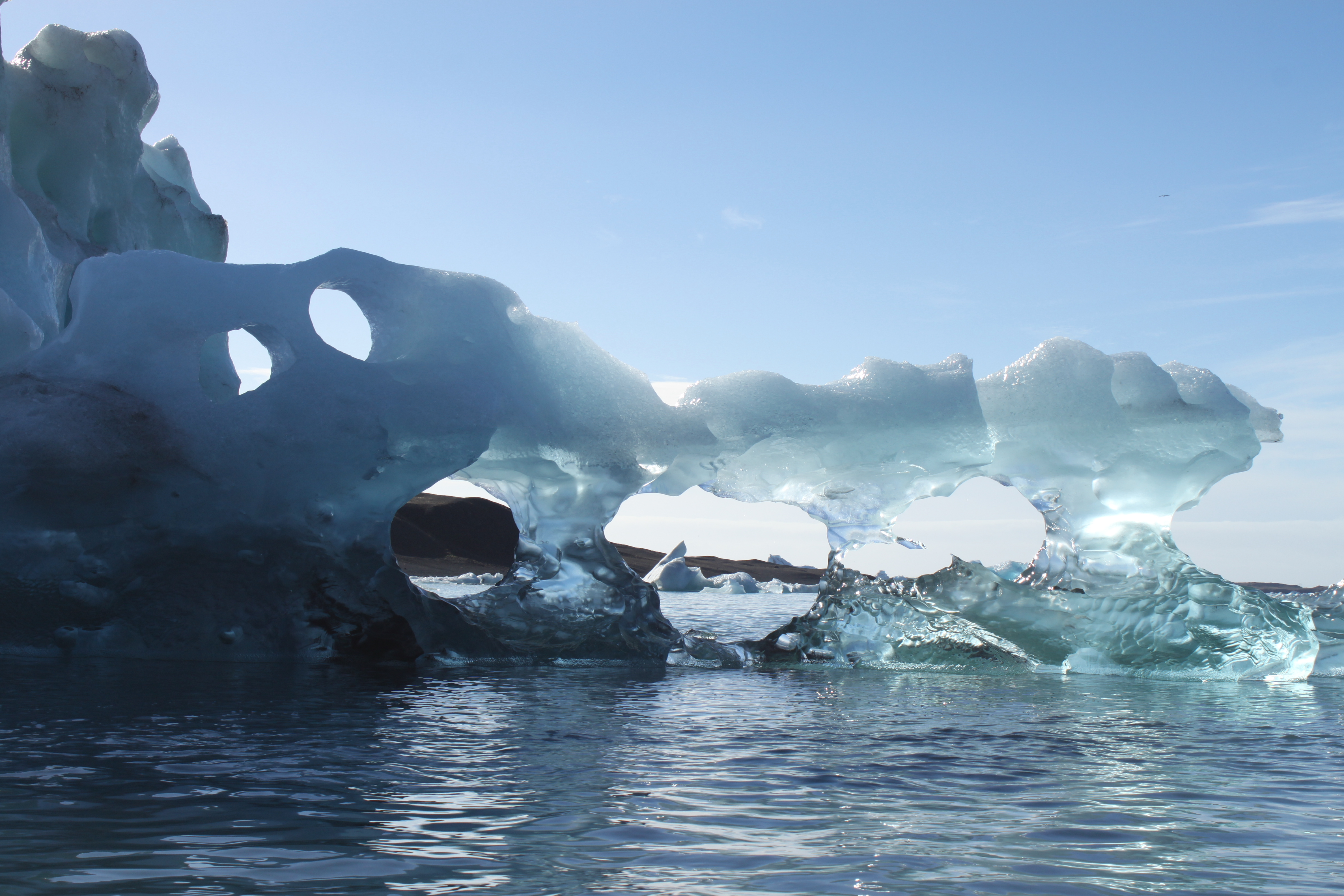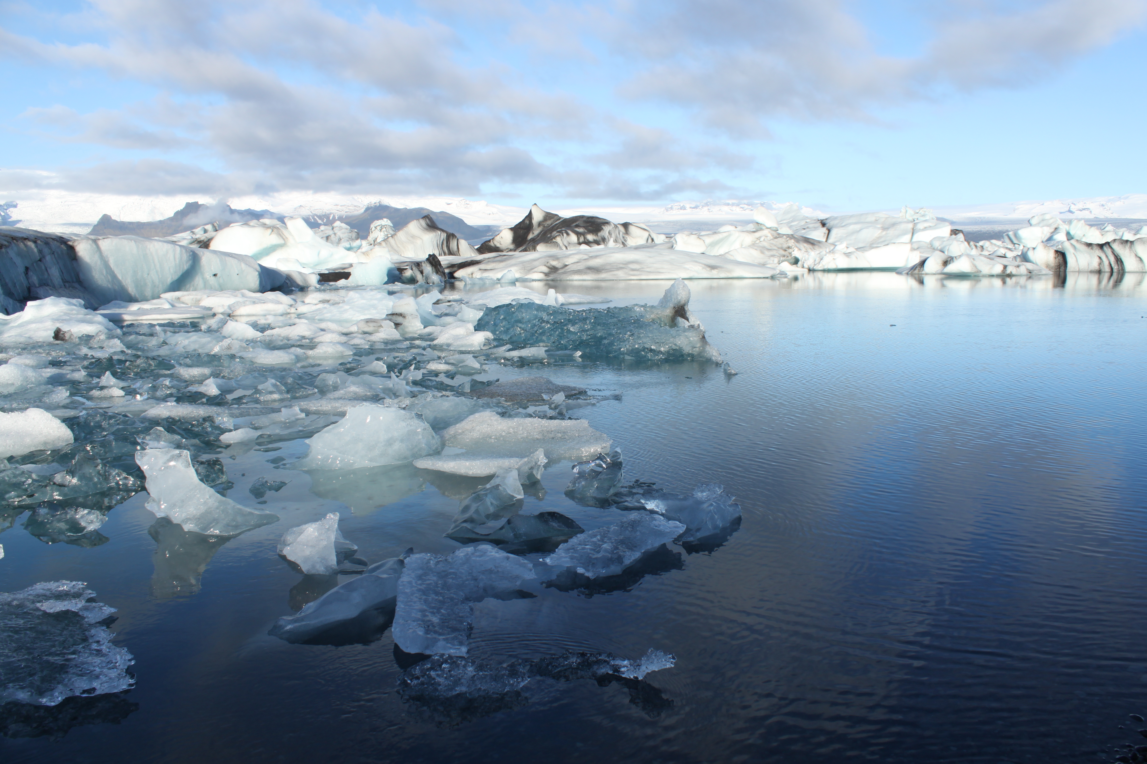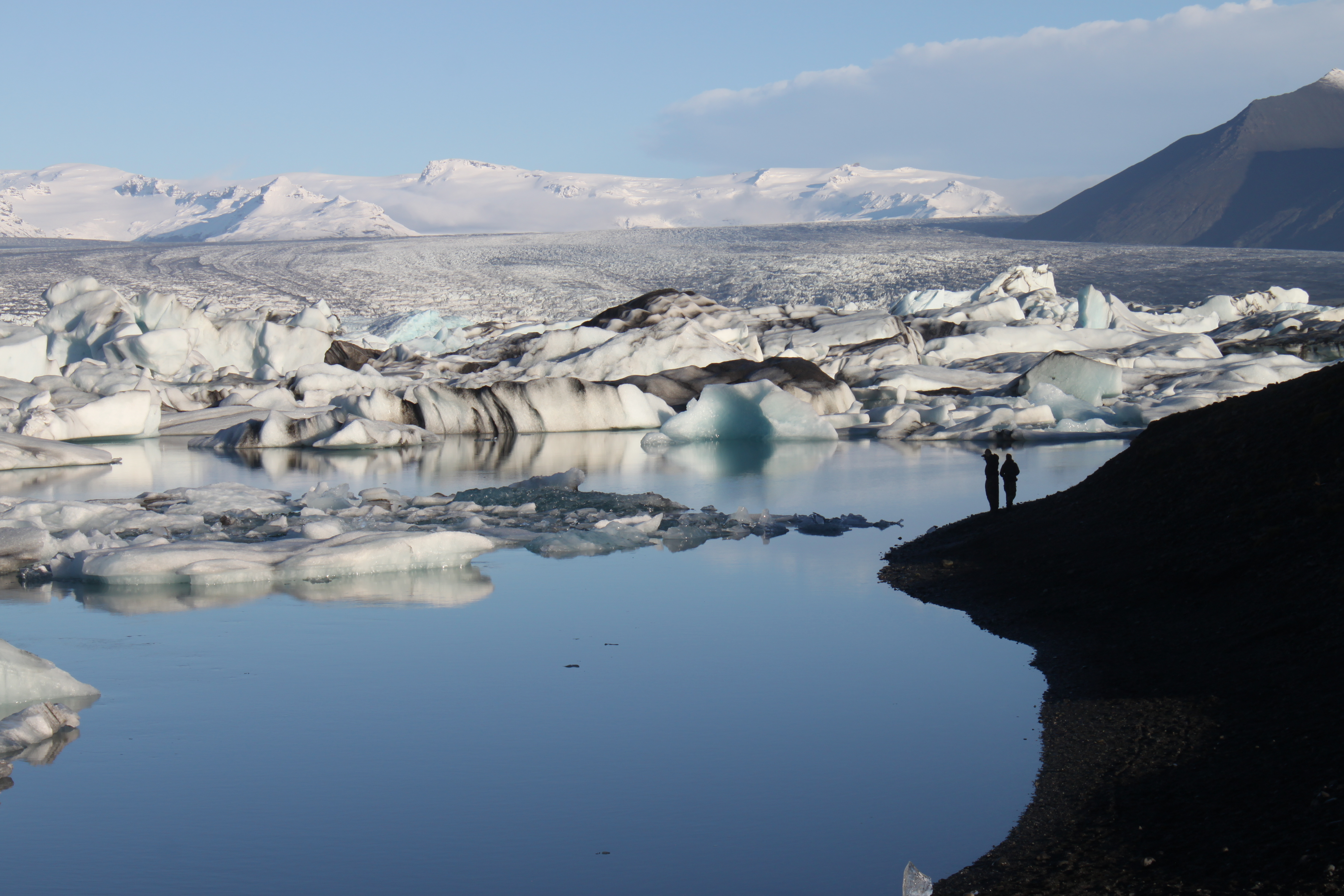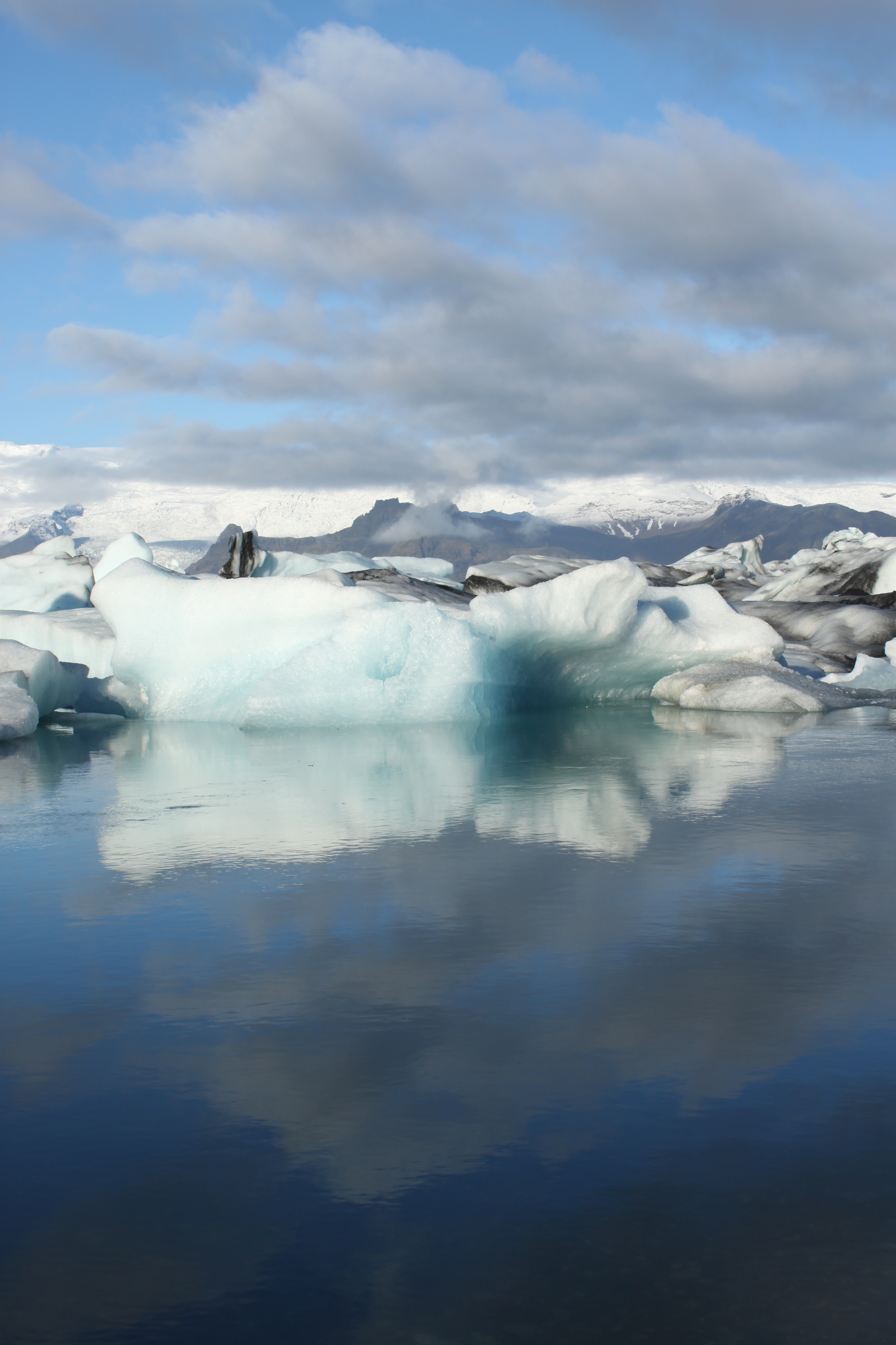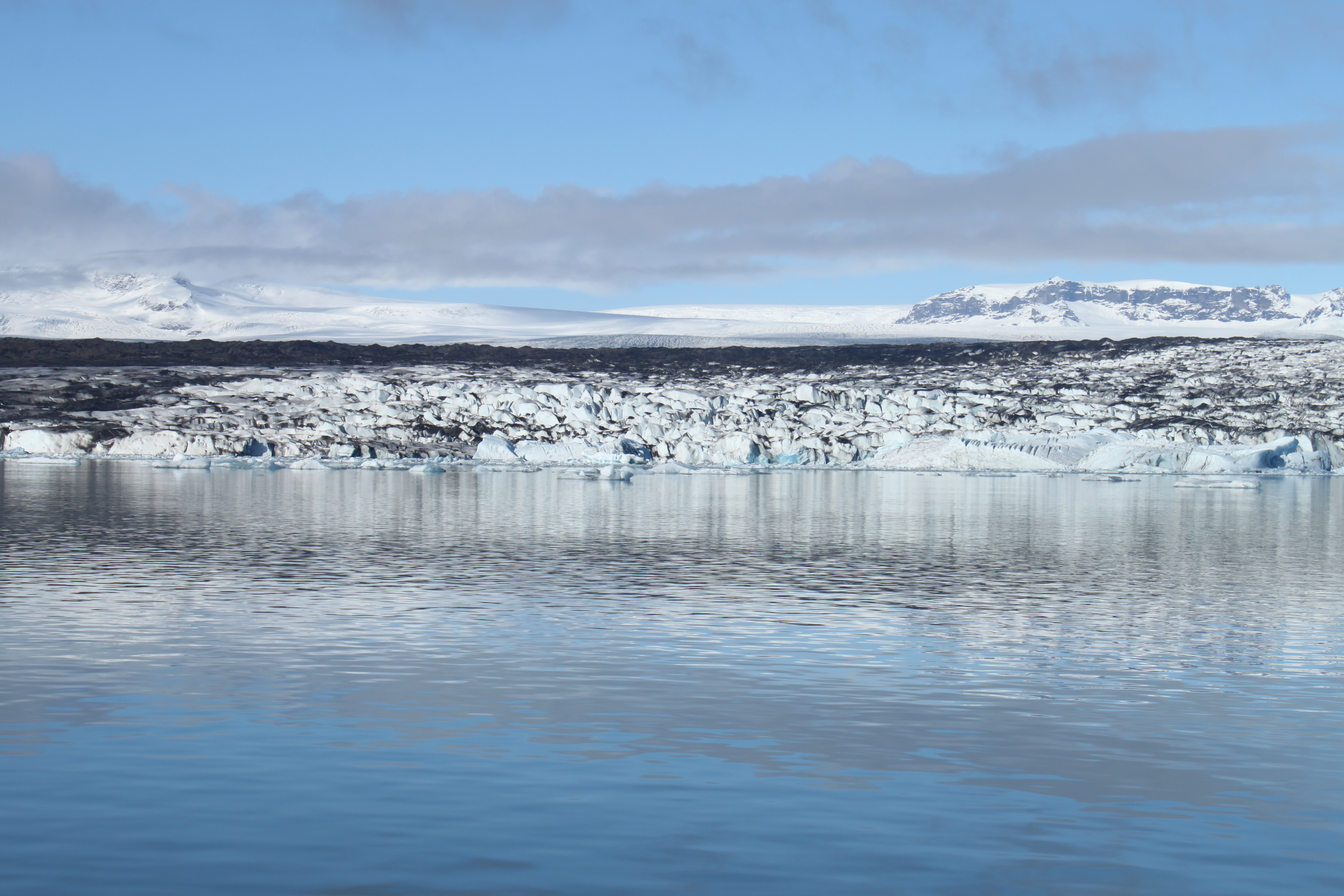 Jökulsárlón is a lagoon at the foot of a glacier, a tidal pool filled with icebergs that break off and crash into the water, that breathe and creak and heave with the ocean rising and falling underneath them, a live animal corralled by a bridge. Seals slipped in and out amongst the bergs. Everything was blue, luminous and glowing and milky despite the haze and the rain. Icebergs were streaked with centuries-old ash from volcanic eruptions, the water’s surface calm in the rain’s pause. I watched other tourists taking photos, popping bright umbrellas, putting their fingers in the clear glacial water.