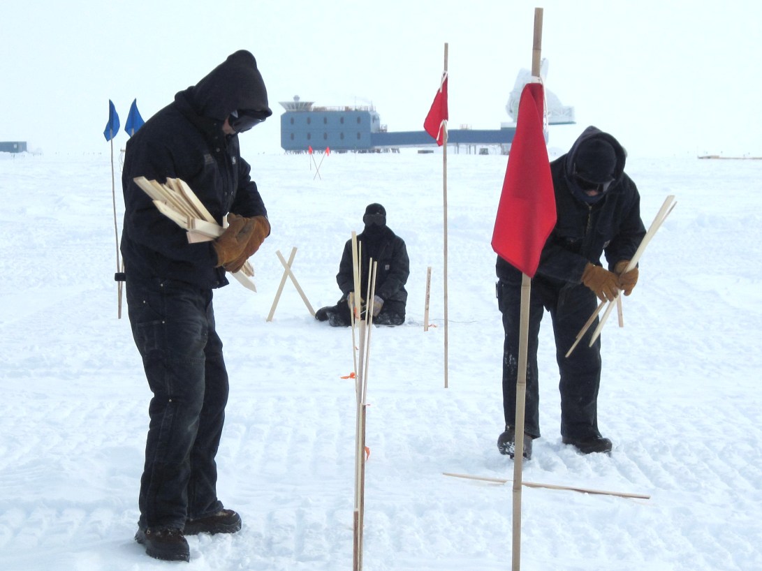 Based on the GPR readings (ground-penetrating radar), the blasters placed stakes along the outer edges of the buildings of the original South Pole Station from the 1950s, now buried under many years of snow drifts, maybe 20 feet below the surface. It was ghostly to walk on top of—knowing that under our feet were open rooms, food left on tables, fuel caches, trash, pee jars and girlie magazine centerfolds plastered on every surface.