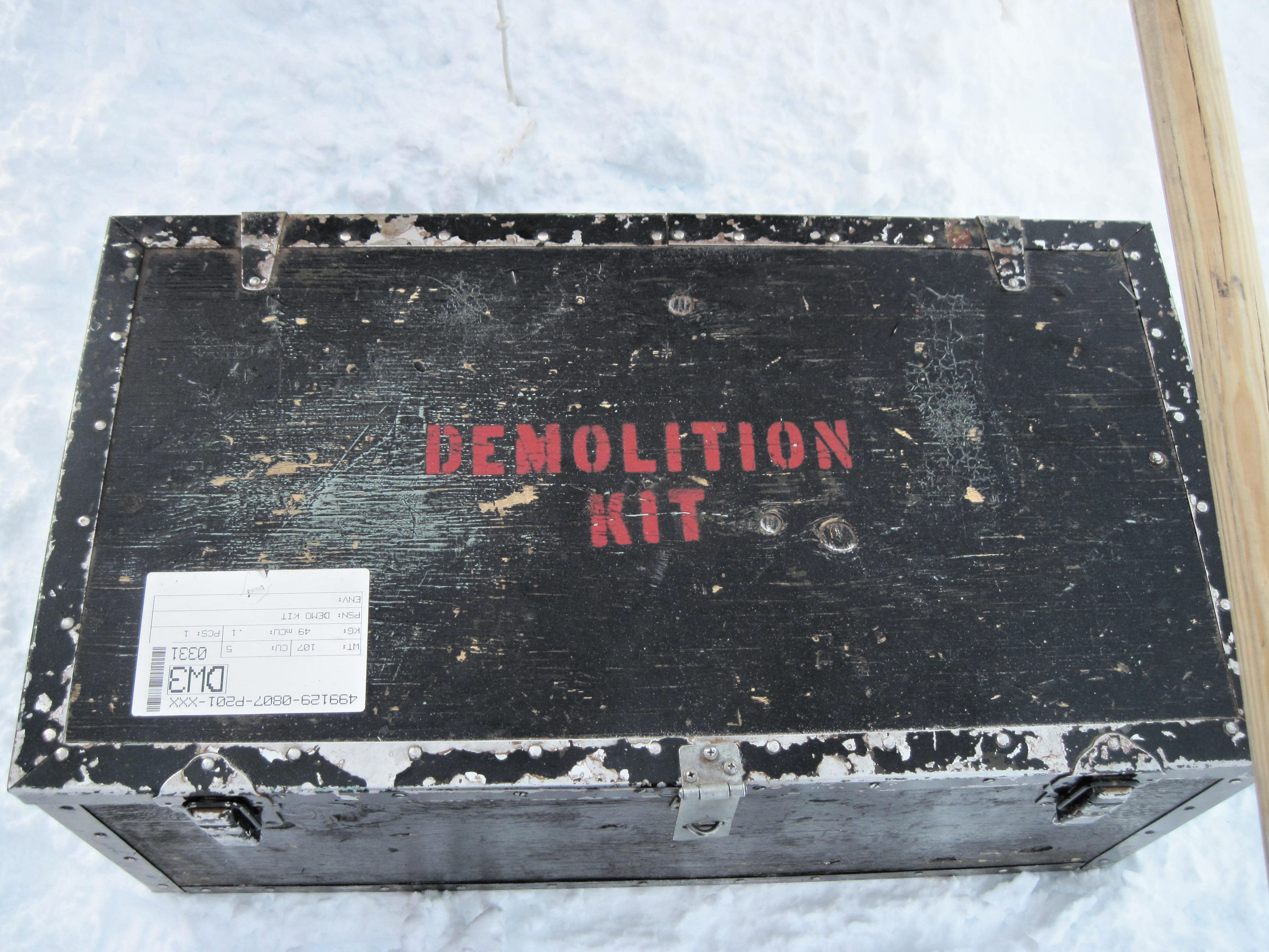A few days later, those of us who had helped drill and/or lay the dynamite (mostly G.A.s and a few station management personnel) went out to the site to view the blast. The lead blaster had instructed us to always keep an eye on him; while we of course wanted to watch the explosion, we had to be ready to jump behind a Pisten Bully in case something went wrong. Jason, one of the G.A.s who had worked many days with the blasters got to push the plunger, blowing up all the thousands of pounds of dynamite and the contents of the structures below.