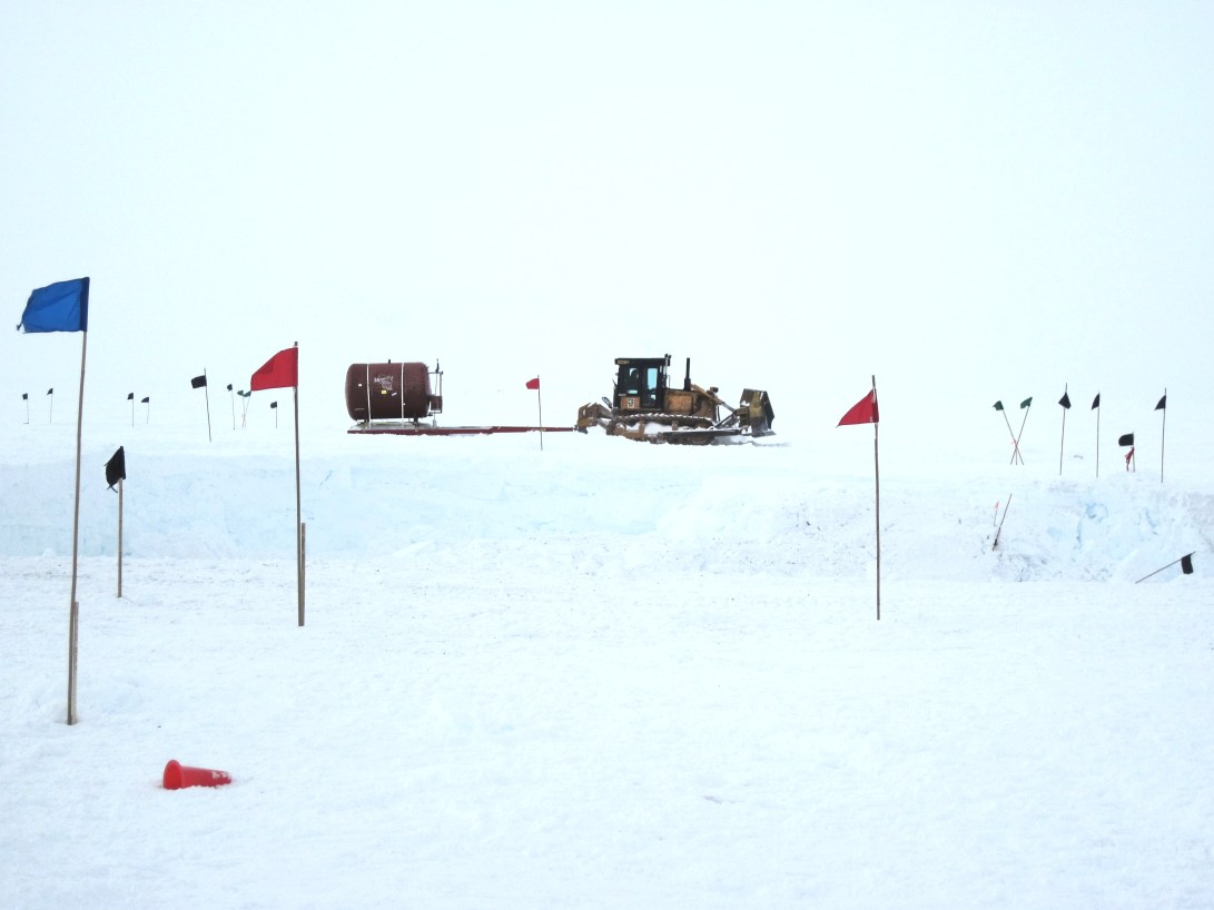 The incoming South Pole Traverse, the tiny speck right in the middle of this photo. On the left, lines of storage berms and the Remote Satellite Facilities, on the right, the runway.