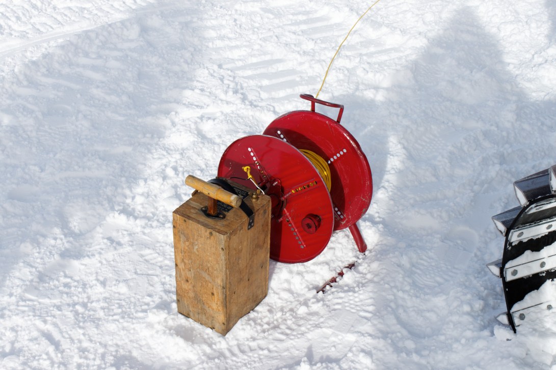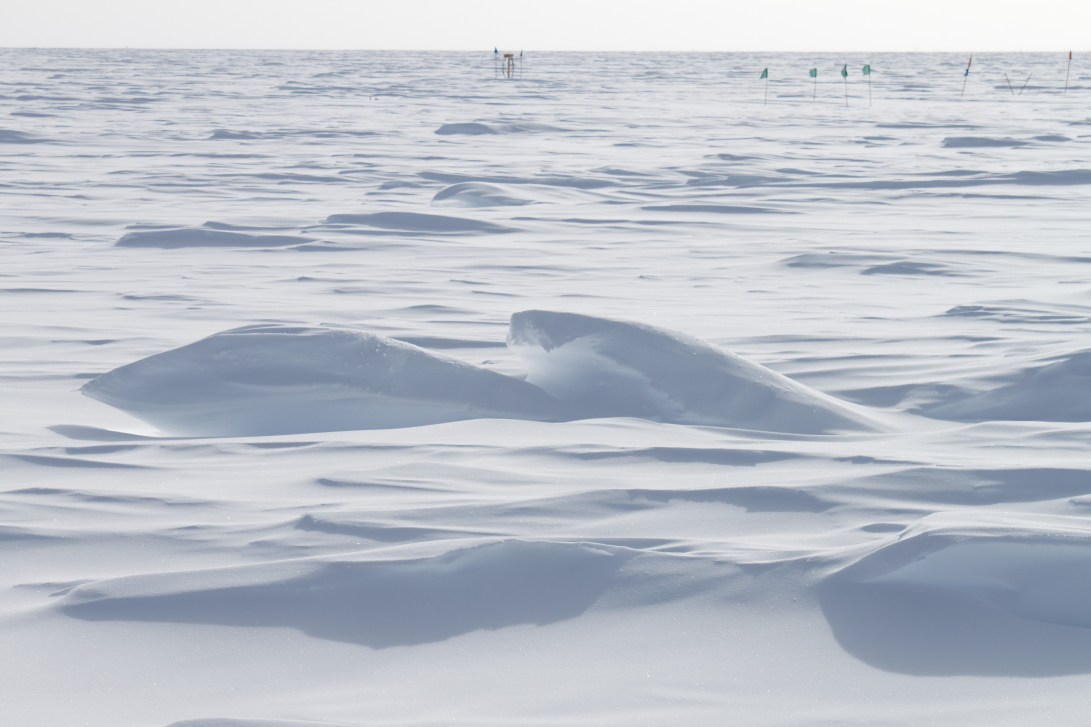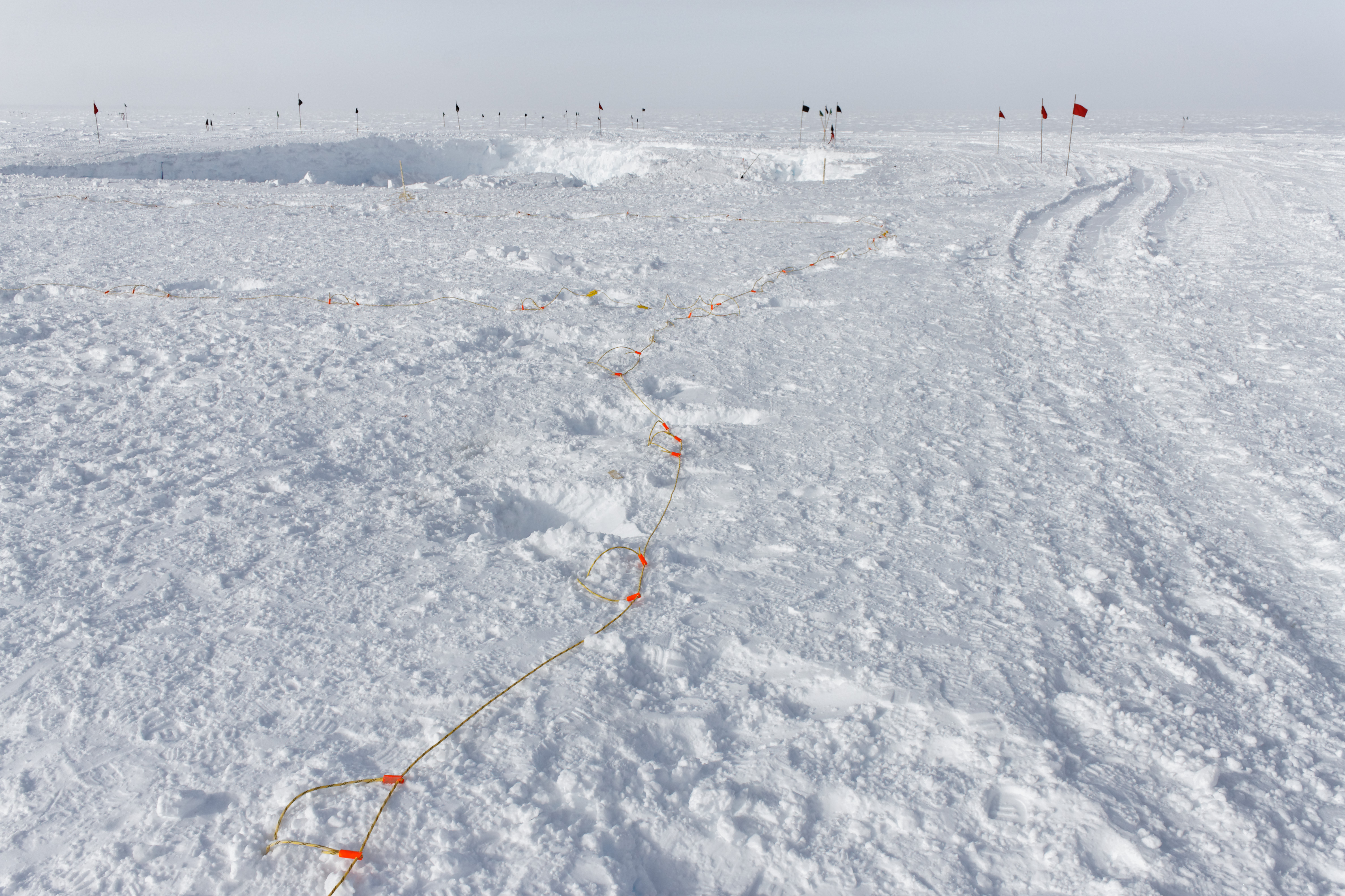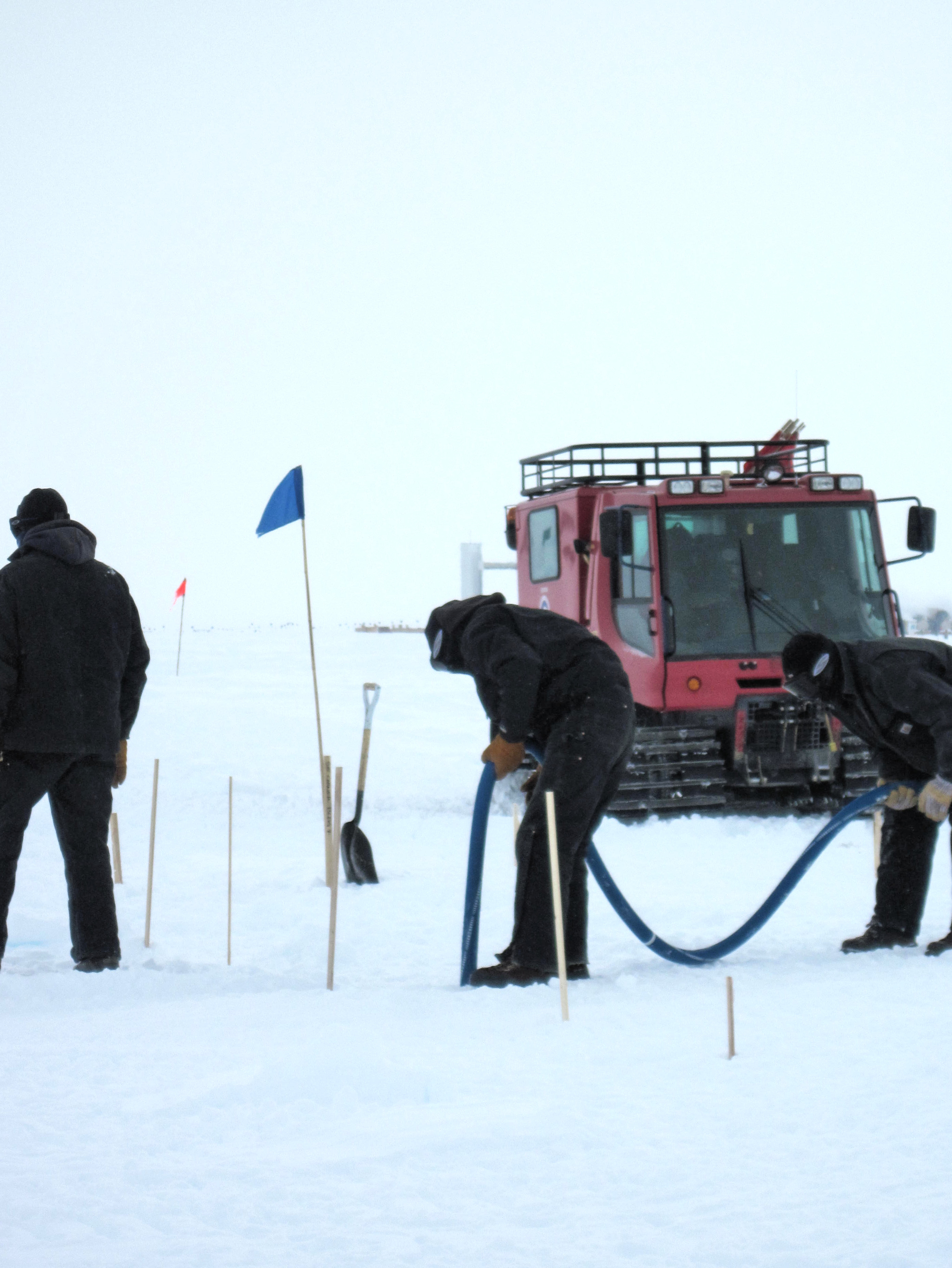To drill the holes, the blasters would place the flat nozzle of the hose on the surface of the ice and turn the valve at the base of the silo, gravity pushing the water through the hose until a burst of steam came from the far end, the water cutting the ice like a hot knife through butter. The blasters fought with the long hose, full and heavy, until it was positioned to slide straight down aside the buried buildings. When they hit the 25-foot mark (or in some cases, a hollow thud on the roof of a building when the GPR readings had been off—these holes had to be re-drilled) they would turn around and hoist the hose out, three or four of them putting the weight of it on one shoulder and tug-of-warring the hose out of the hole, throwing their whole bodies into the effort. When I helped with this part of the process, my puffy leather work gloves were so icy from water and steam that I couldn’t bend them into any other shape than that of gripping the hose.