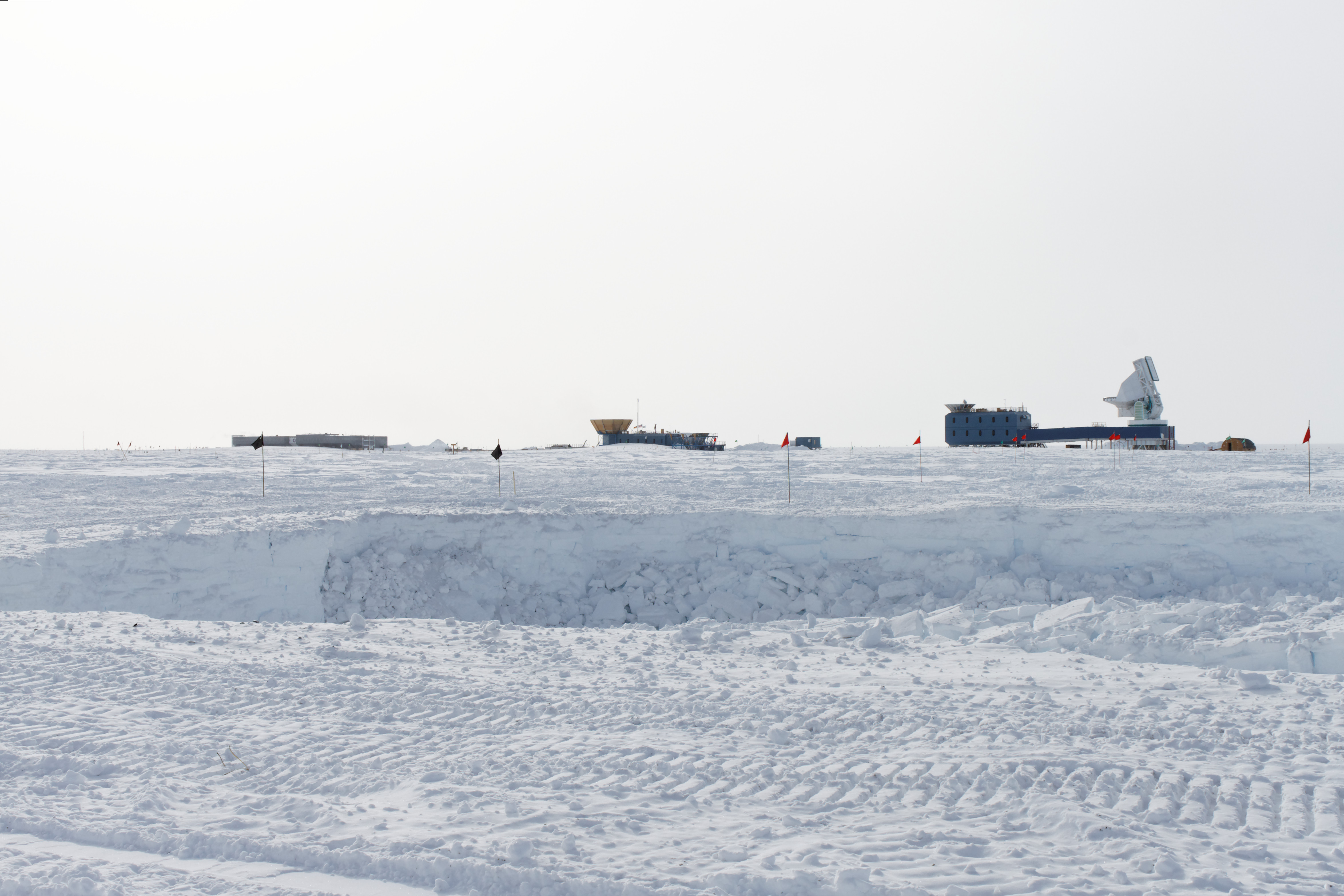 The crater from the first explosion, with the elevated station, MAPO and South Pole Telescope in the background
