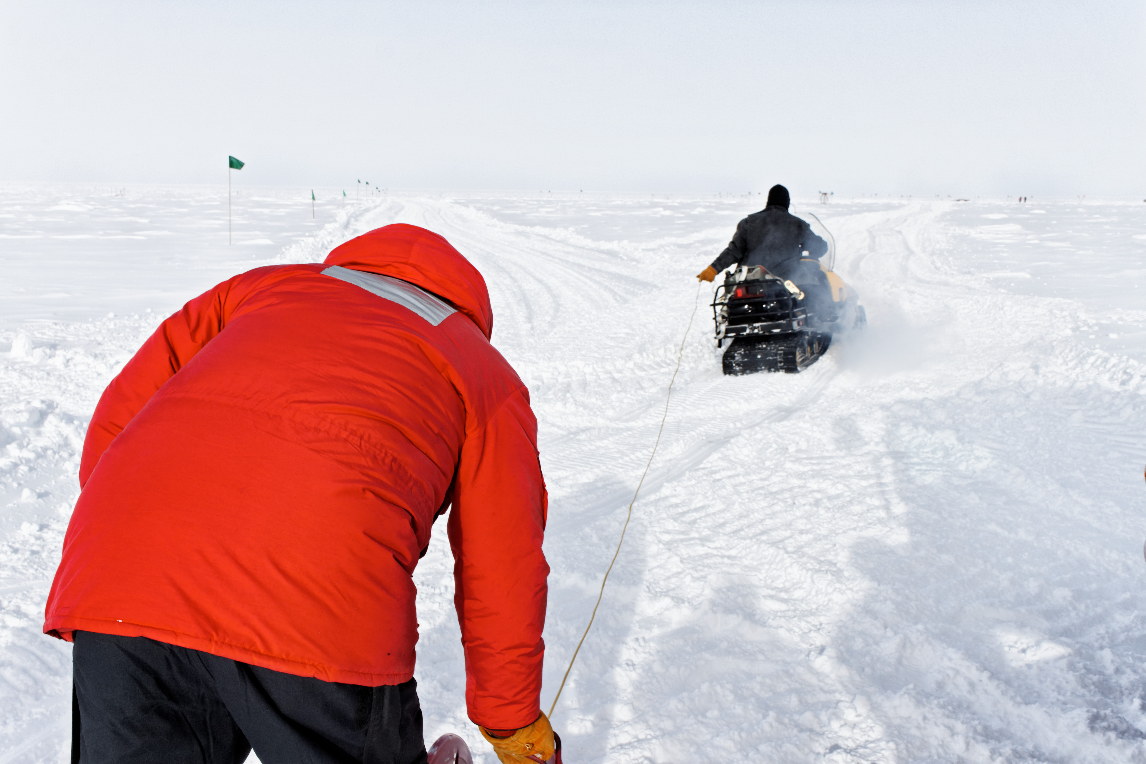I’m not generally excited about airplanes, but at Pole for some reason I felt this little-boy awe and excitement at each first visual, landing, and during takeoff. But my favorite thing about working with Fuels was checking the skiway every morning to ensure it was safe for the day’s aircraft to land—riding the snowmobile a few miles out and looking for debris and downed runway flags. On a clear day I could see the endless horizon, the sun reflecting brightly off the windpolished snow, the station far, far away. And on a windy day I couldn’t see the station and my radio wouldn’t work because of the distance, and despite the reassuring rumble of the snowmobile, handles warm and vibrating under my frozen thumbs, I got a little glimpse of the frozen, barren wasteland I’ve heard so much about, stepped foot on, lived in, but so rarely saw.