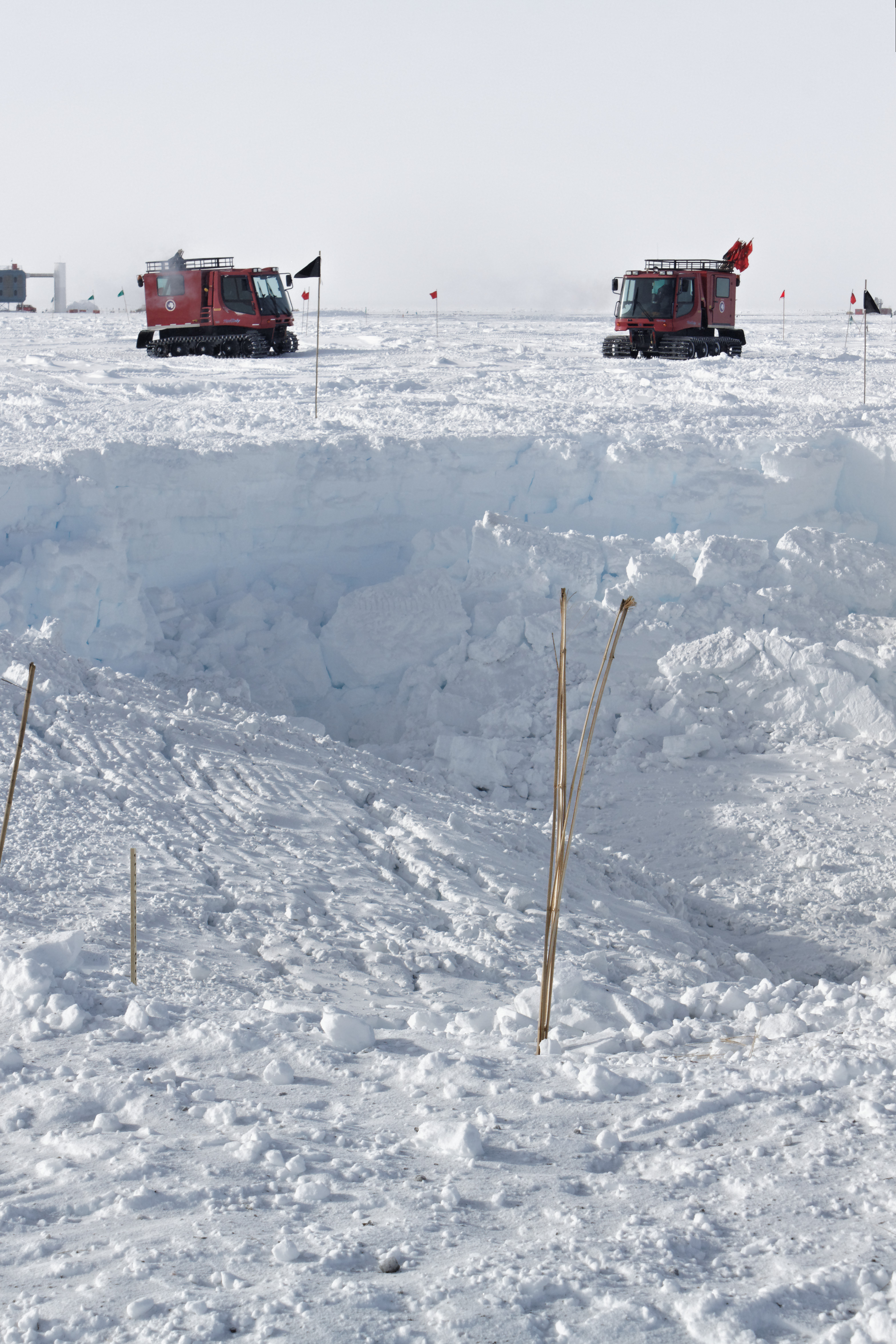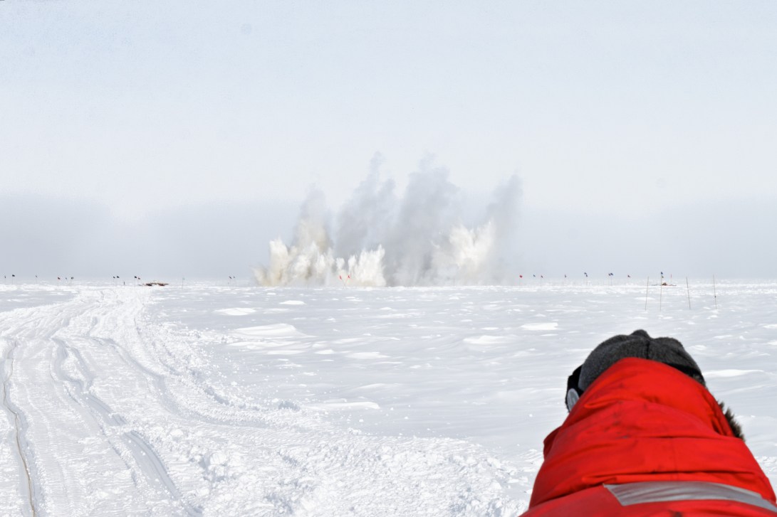 On a windy day in early December, I got to help blow up the South Pole. That morning, a slim band of pale blue sky sat between the white horizon and white clouds, looking really quite pretty from the station. People were getting up from their coffee (dayshift) or cocktails (nightshift) to look out the galley windows, taking pictures, gazing. We took the warm Pisten Bully out past MAPO, past the South Pole Telescope and down a little flagged snow road, pulling up to the snow crater from the first blast just a few days before, the men still smelling like dynamite. We had watched it from Destination Alpha but both Daniel and I, on different levels completely with different cameras, looked away at just the wrong moment and missed the main explosion—the sound arrived some ten seconds later, traveling super-slow through the high altitude air.