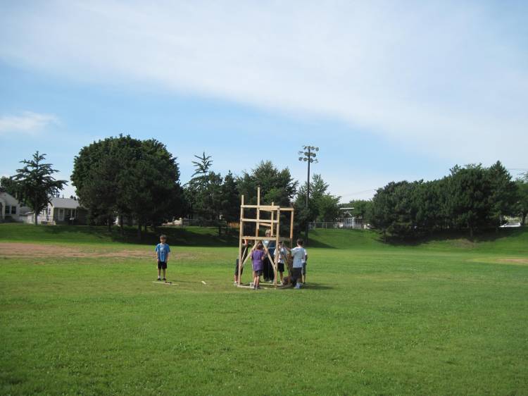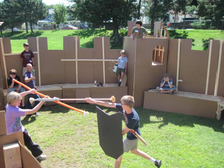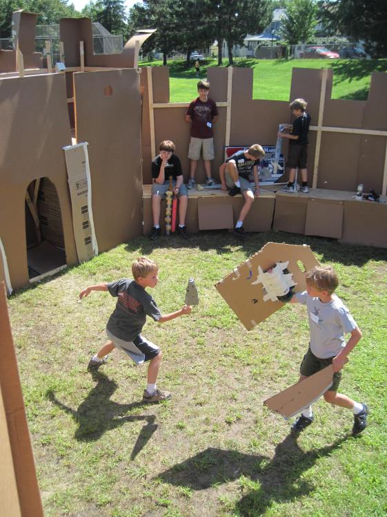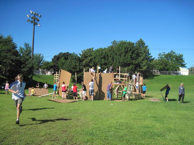 I work at a kids’ day camp in Minneapolis and St. Paul called Leonardo’s Basement– a really cool organization that focuses on art, science and technology for kids of all ages. Every year, we have a one week class dedicated to building a cardboard castle from lumber, screws, refrigerator boxes and creativity: a full size, two story, five-towered beast of a playhouse.