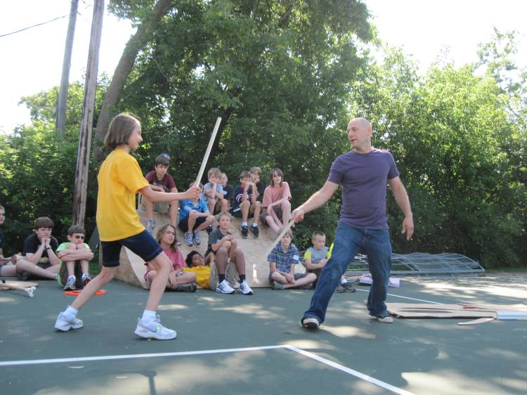 A student practicing safe swordplay with Julian, the teacher responsible for the magical mayhem